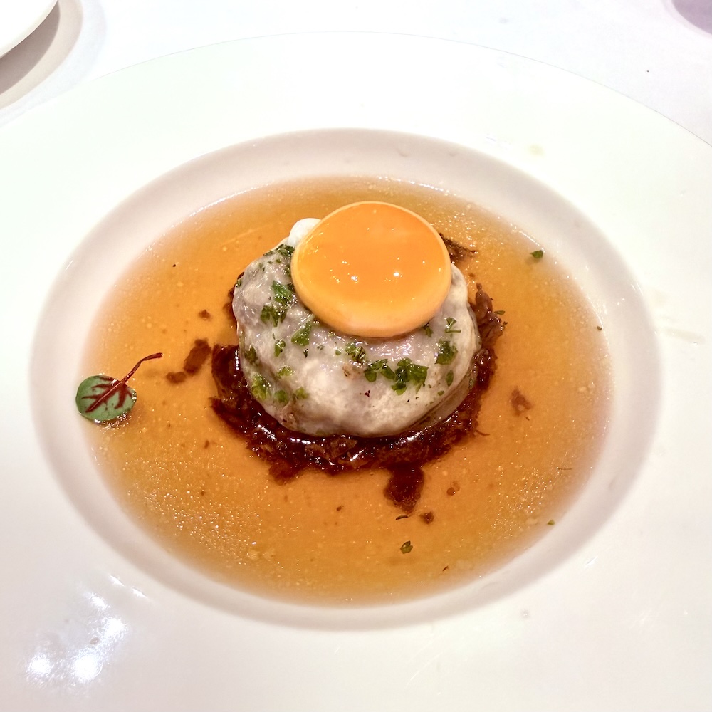 The course titled Tail and Ribs unfolded with quiet drama. A clear oxtail consommé was poured tableside over a porcini mushroom, beef rib-filled ravioli, and a fresh egg yolk. The heat of the broth gently cooked the yolk, enriching the soup just enough.