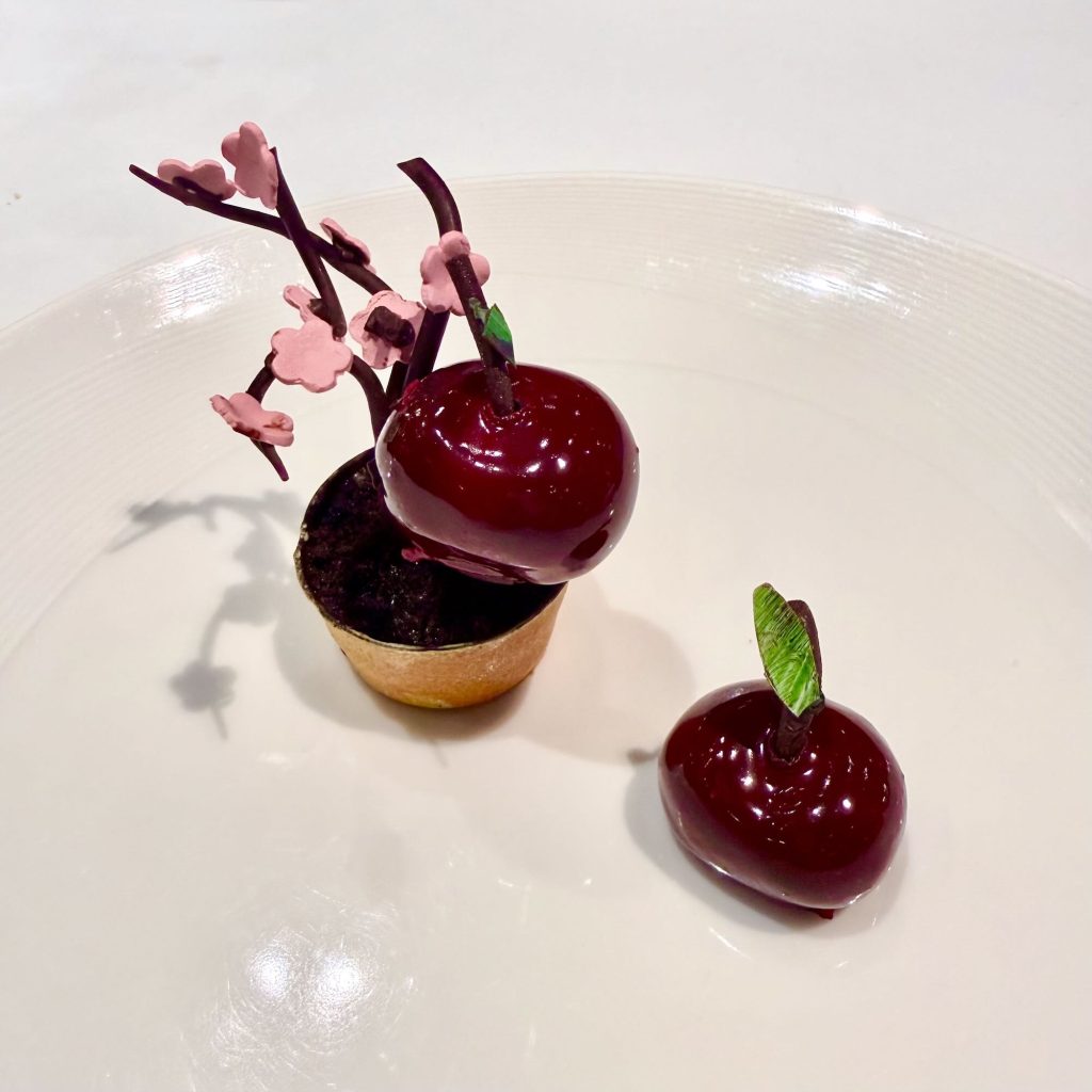 Even dessert carried its own intrigue. Sweet Georgia Blossoms arrived as a sakura-inspired creation: cherry whipped ganache layered with cherry compote and chocolate sponge cake. At its heart, a hidden caramel lava flowed freely once pierced—an indulgent finale that was both playful and intense.